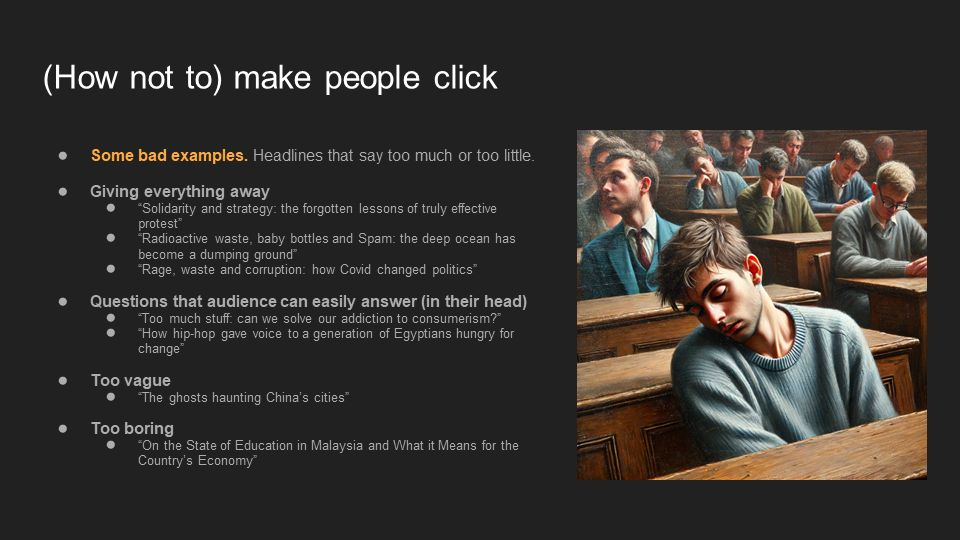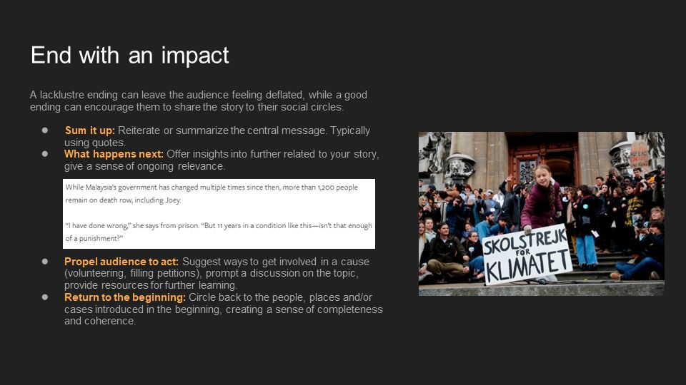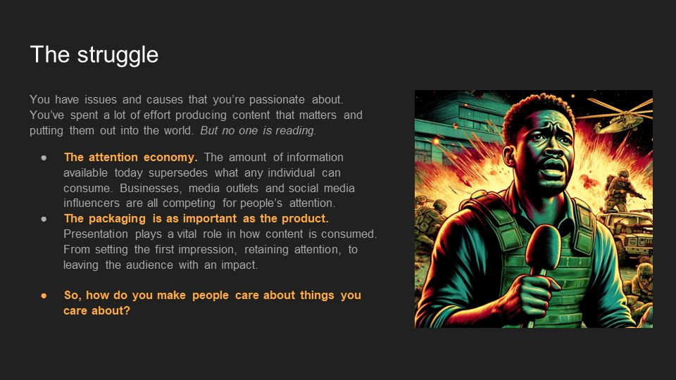 Last month I was asked to prepare a lecture on storytelling in digital media, and this is the deck I’ve used. This lecture is geared towards journalism students who need a guide on how to tell effective stories, from brainstorming ideas all the way to writing endings. It can also be used in any other context that needs storytelling, such as for NGOs coming up with a media piece to pitch to news outlets.